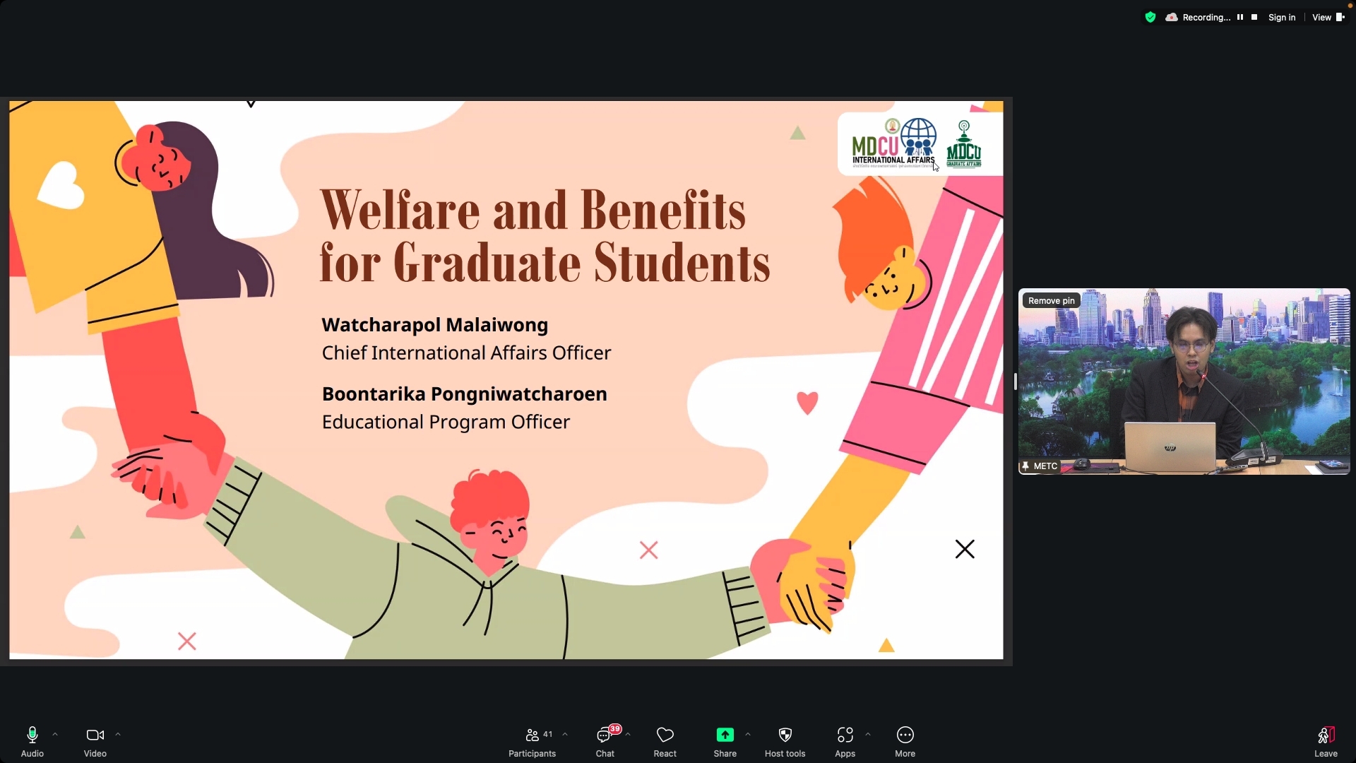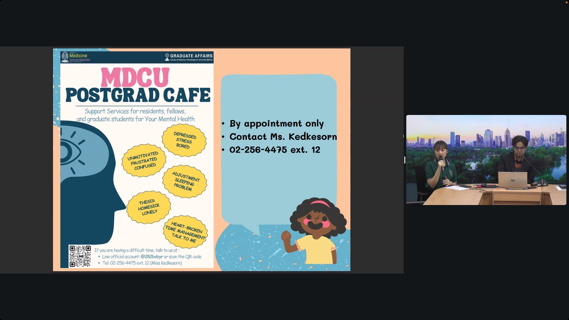 • Mr. Watcharapol Malaiwong (Chief of the International Affairs Department) and Miss Boontarika Pongniwatcharoen (Graduate Affairs Officer), who discussed student wellness and support services.
