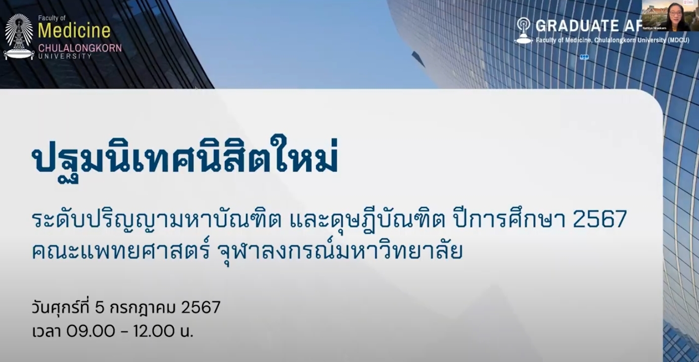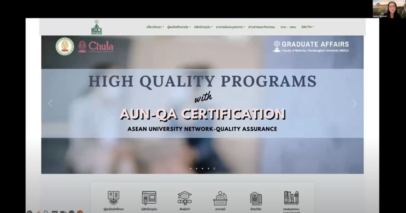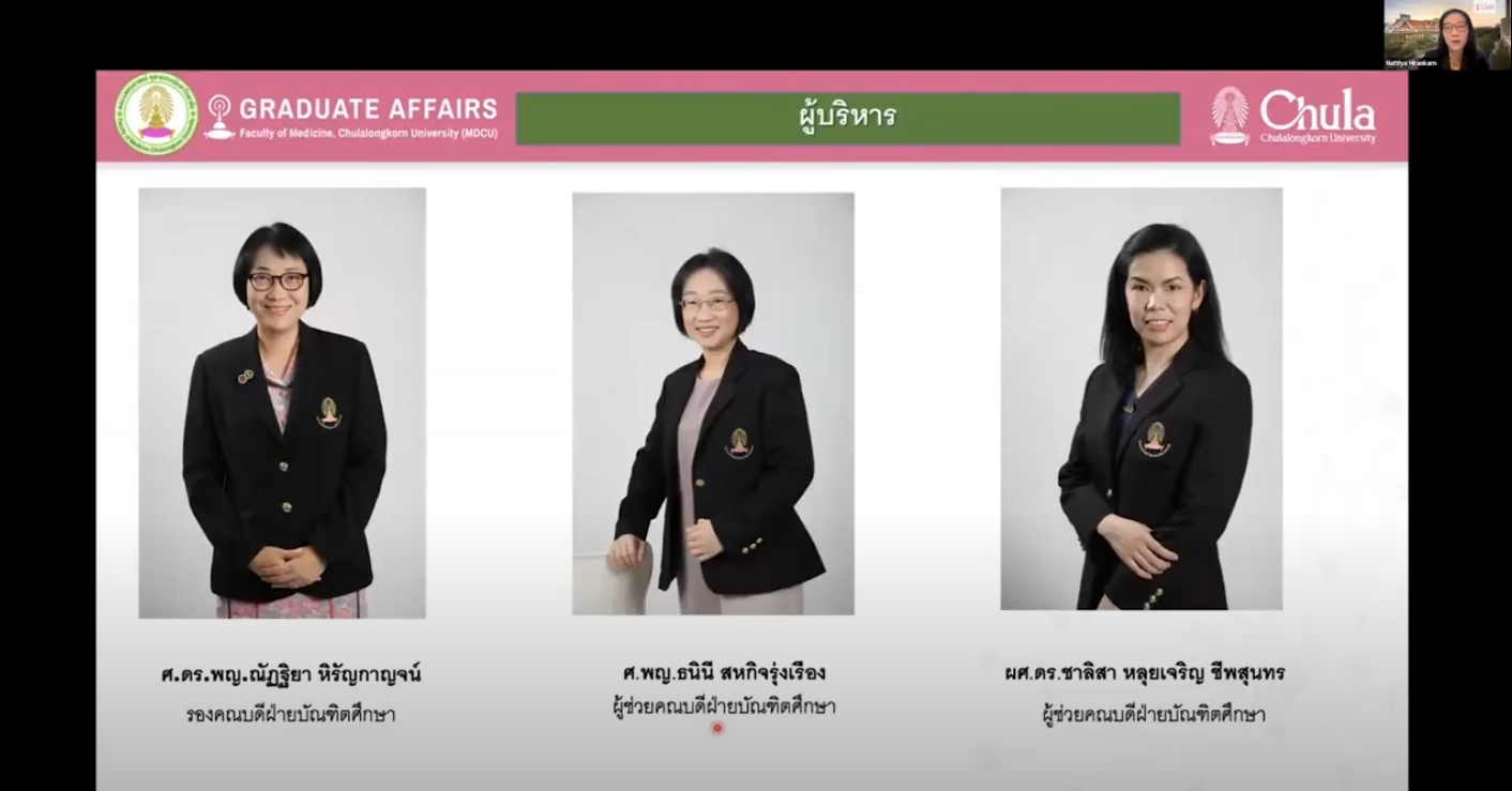 The participants were greeted with a warm welcome speech from Assoc. Prof. Chanchai Sittipunt, M.D. (Dean of the Faculty of Medicine), who provided an overview of MDCU’s mission, values, and goals. Prof. Nattiya Hirankarn, Ph.D. (Associate Dean for Graduate Affairs), also spoke in the first session, introducing the Graduate Studies program at the Faculty of Medicine.