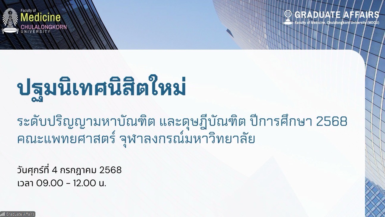 Our new students were greeted with a warm welcome speech from Prof. Nattiya Hirankarn, Ph.D. (Associate Dean for Graduate Affairs), also spoke in the first session, introducing the Graduate Studies program at the Faculty of Medicine.